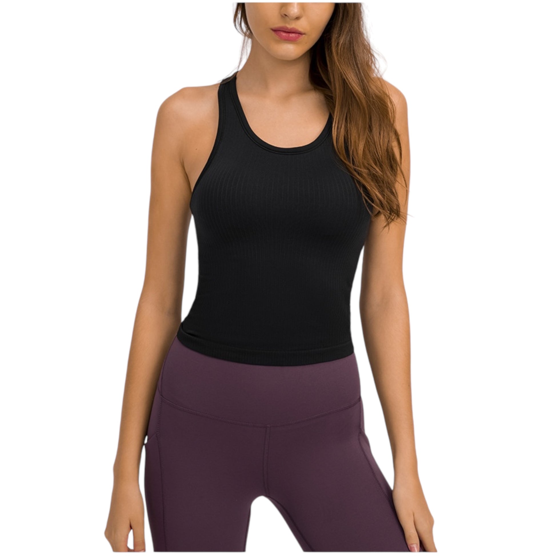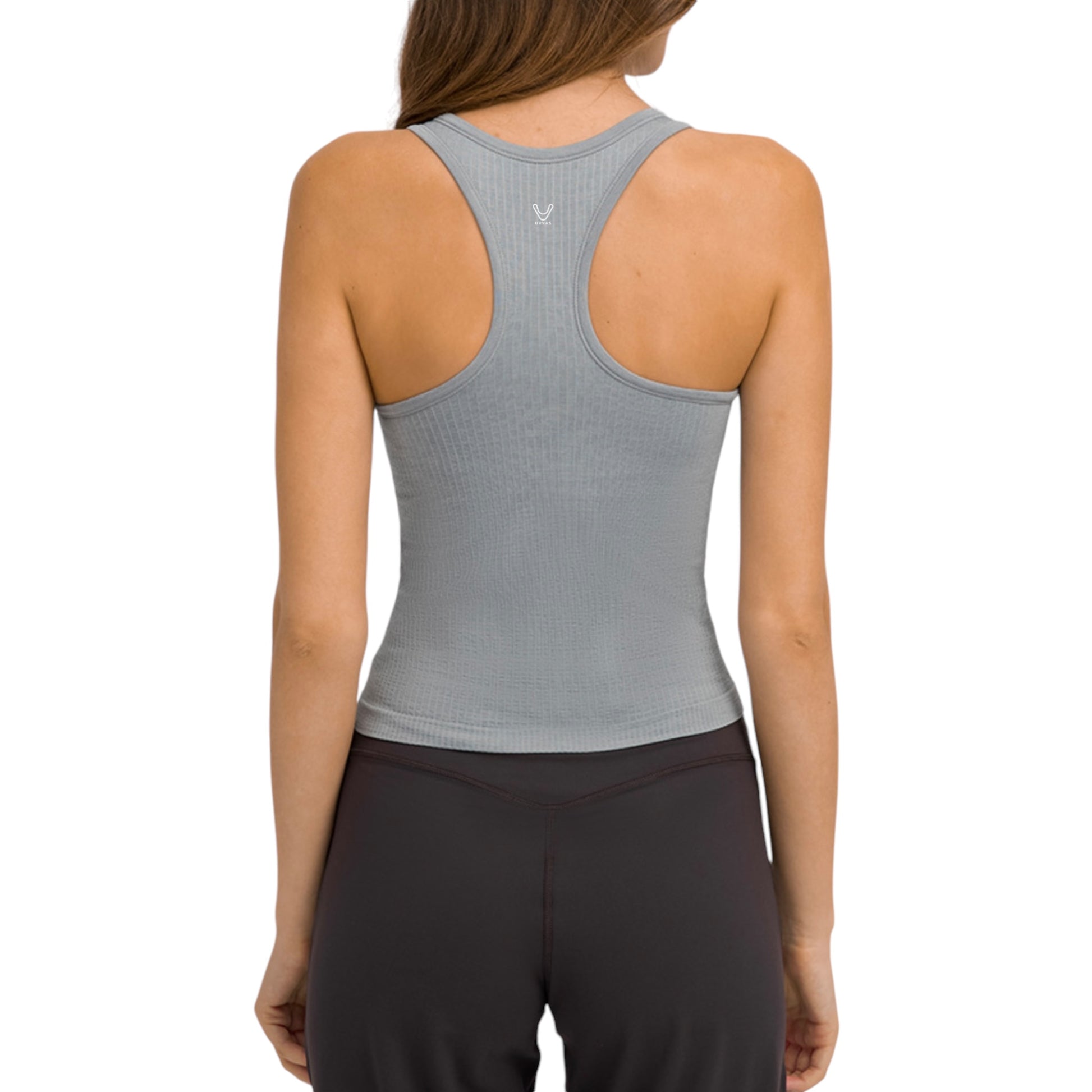 Racerback ribbed tank top with removable chest pads for easy on and off.