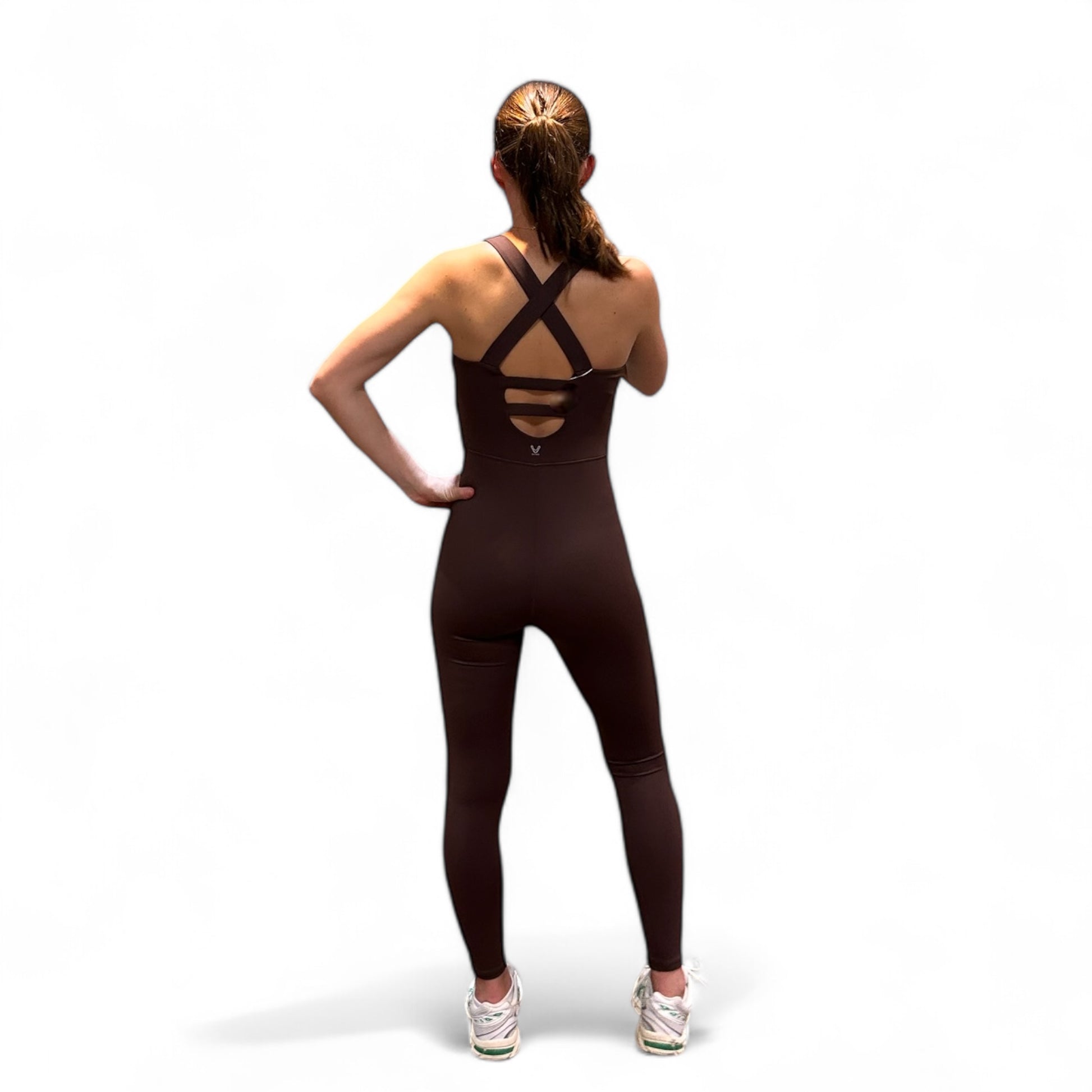 One-piece bodysuit featuring a round neckline and cross-back design, complete with removable chest pads.